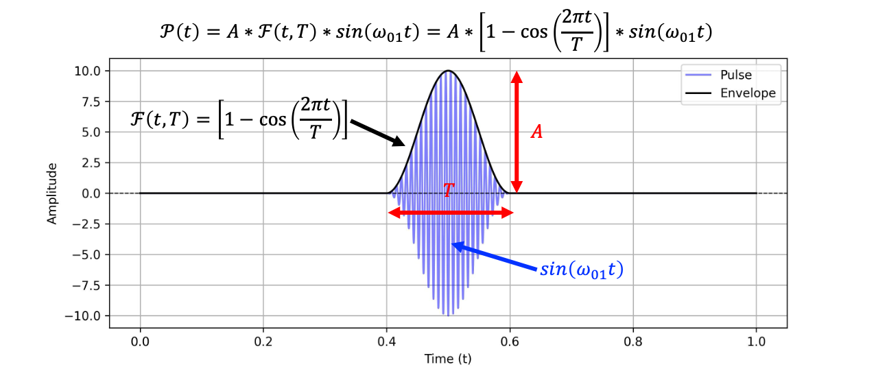 一個完整的脈衝可以表達為: \[ P(t) = A \cdot F(t, \tau) \cdot \sin(\omega_{01} t) \] 舉例如下: