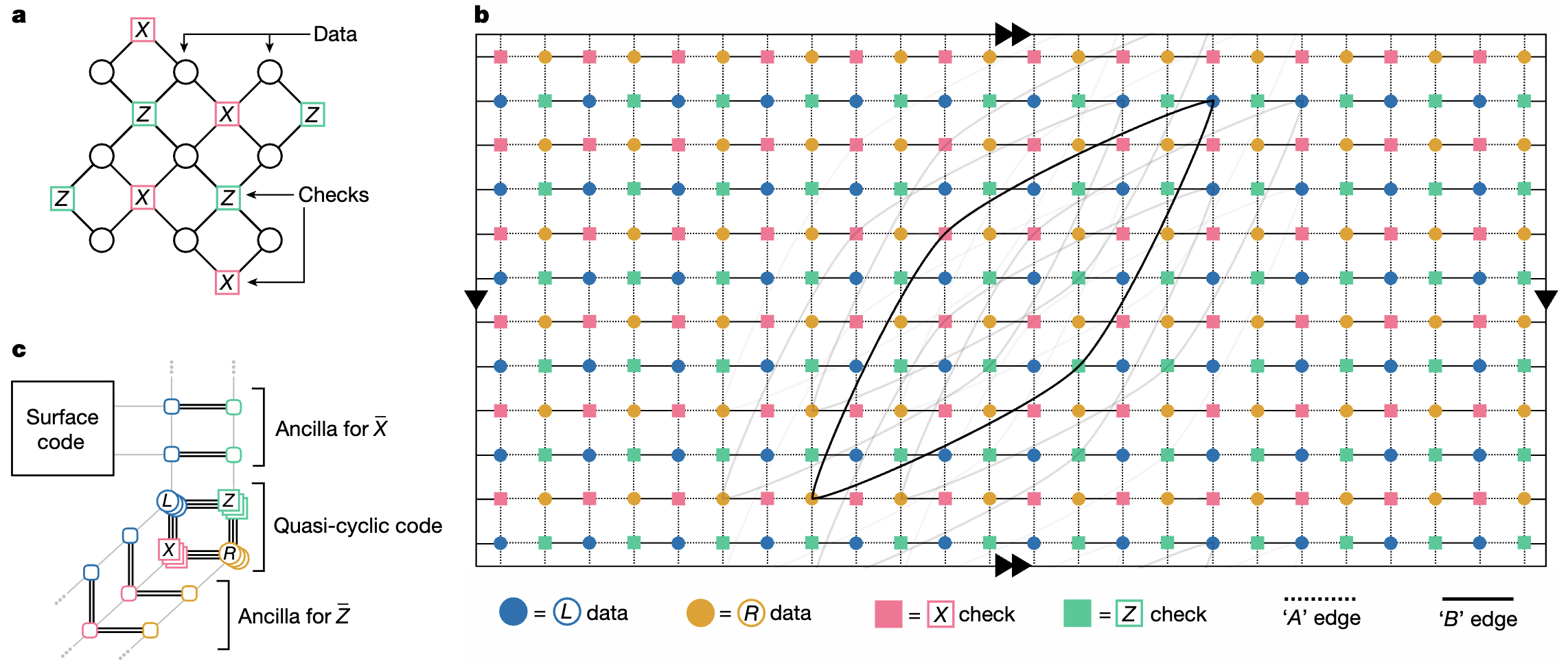 ▲ IBM論文中比較傳統的表面碼(Surface Code)與新型且高效的雙二分碼(Bivariate Bicycle Code 簡稱 BB code,屬於qLDPC的一種)。