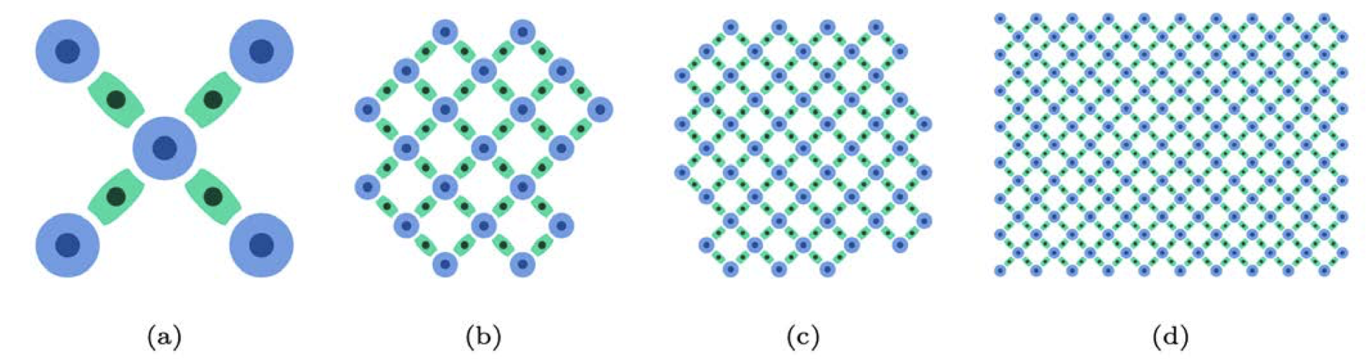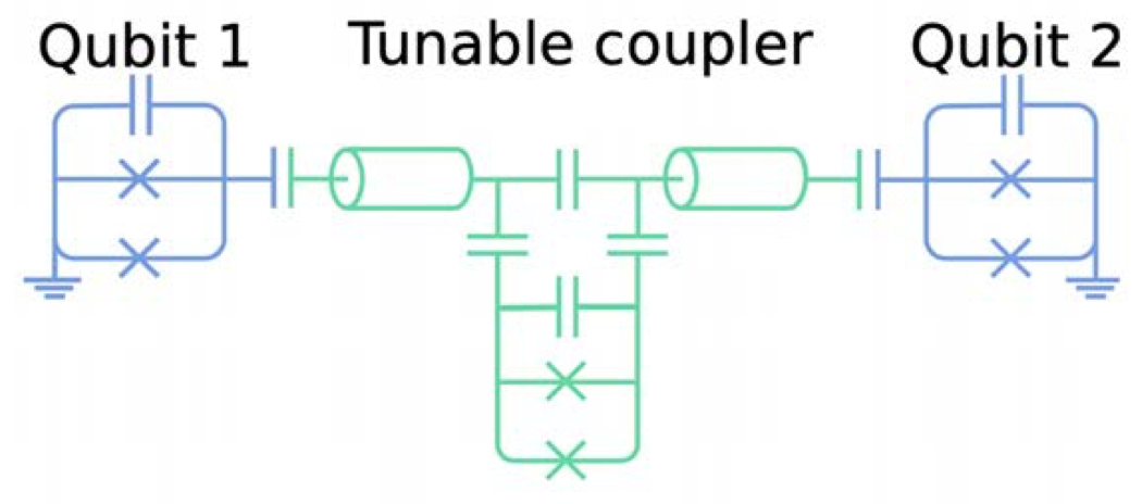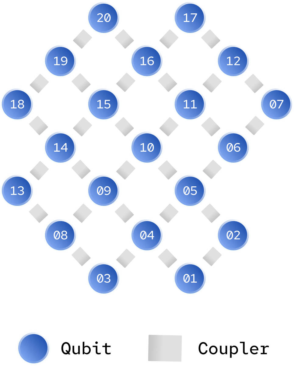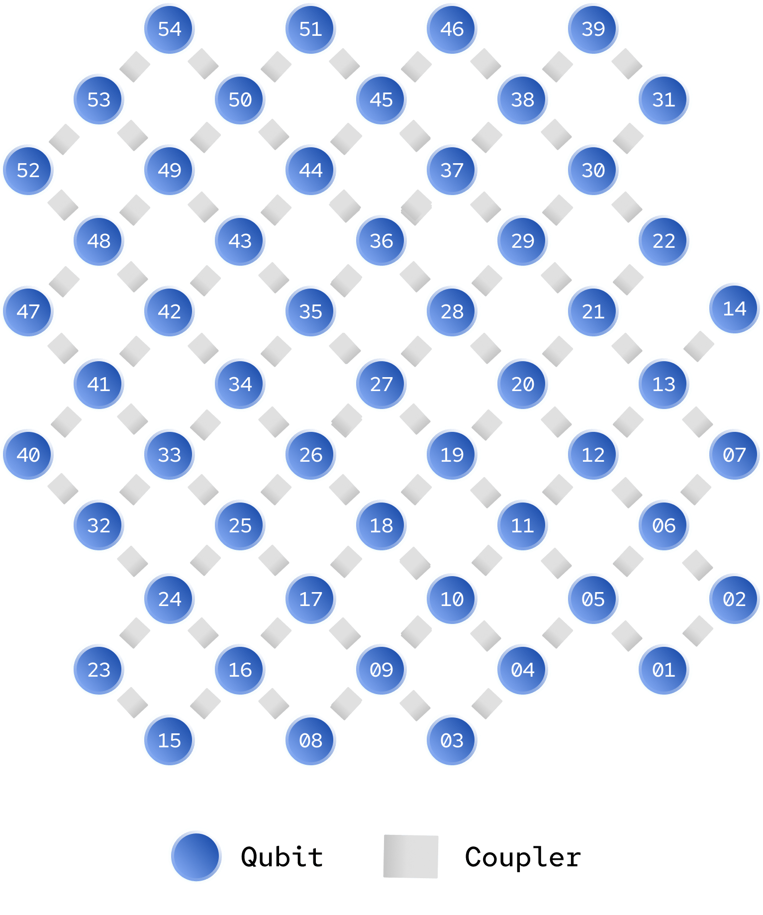 ▲ IQM傳統的可擴展四邊形架構,可從5、20、54、擴展至150 Qubit。每個量子位元間由可調耦合器連接實踐交互作用。