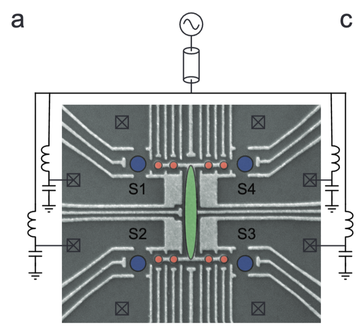 ▲ Using an elongated Single-Electron Box (SEB) as a distributed sensor to measure charge stability diagrams for double quantum dots (DQD) and triple quantum dots (TQD).